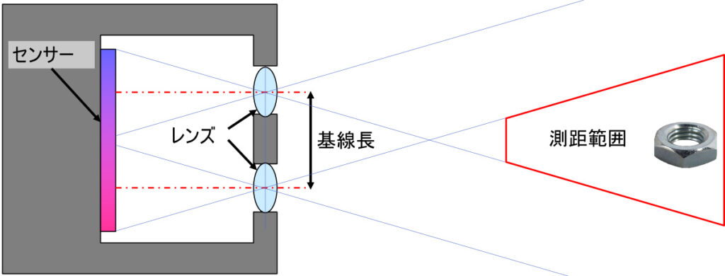 1つの撮像センサーに2つのレンズを搭載した独自構造のステレオカメラを採用しています。レンズ間距離(基線長)を極めて短く設計することで、従来モデルでは困難であった超近距離でのセンシングが可能になりました。この構造により、左右の視差を近距離でも高精度に検出でき、極小物体の寸法を正確に計測できます。