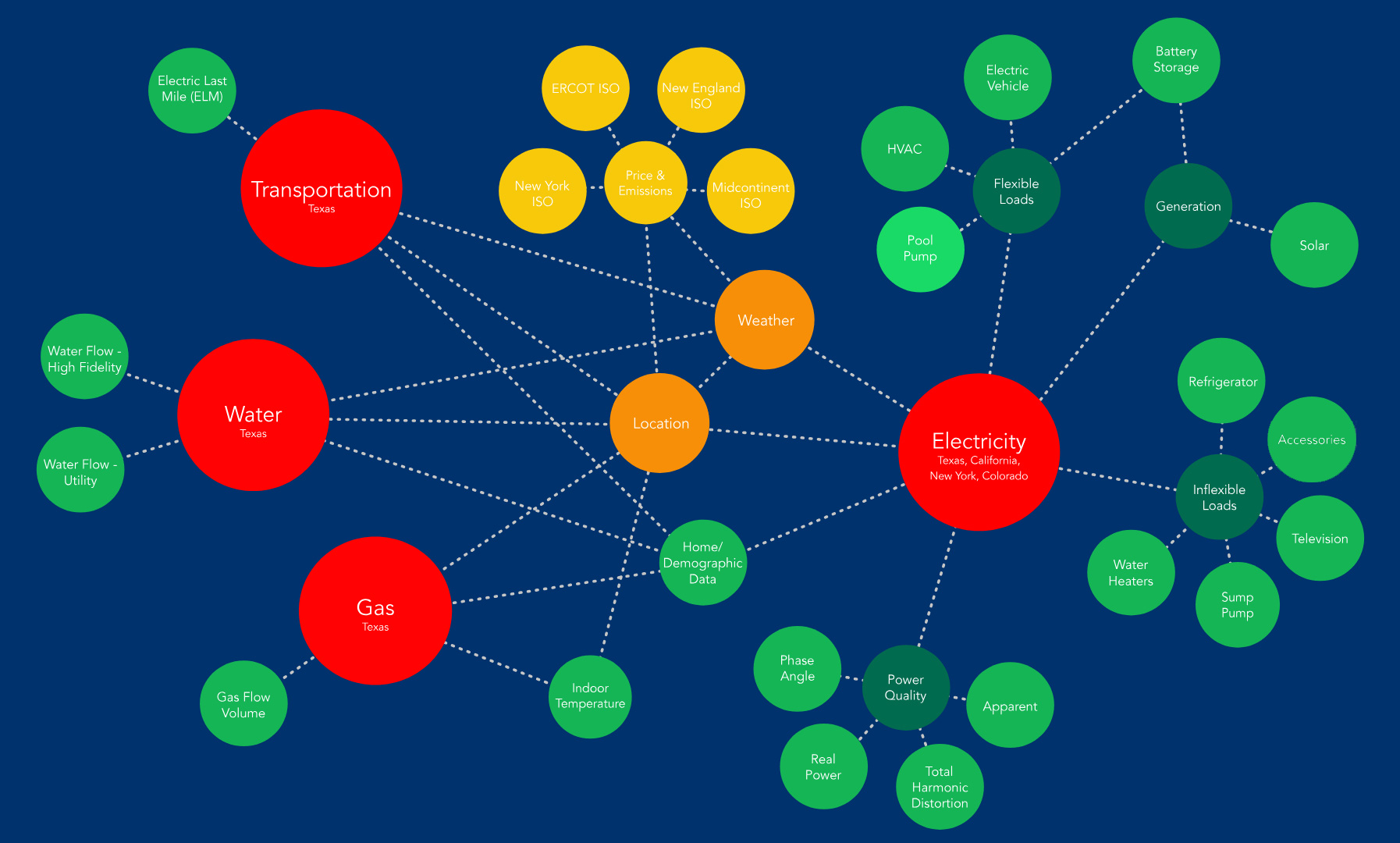 以下の図では Pecan Street DataPort で取得可能なデータを示しています。画像クリック先のメーカーWEBサイトでは、各項目 (色のついた丸)をクリックすることで詳細な情報をご覧いただけます (クリック後に表示される下部の白い枠の中に記載されています)。
