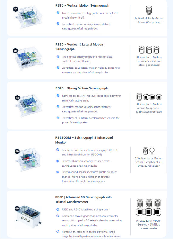 • Raspberry Shake 1D:垂直方向の地震波(Z軸)のみを検出するシンプルモデル。教育や個人観測に最適